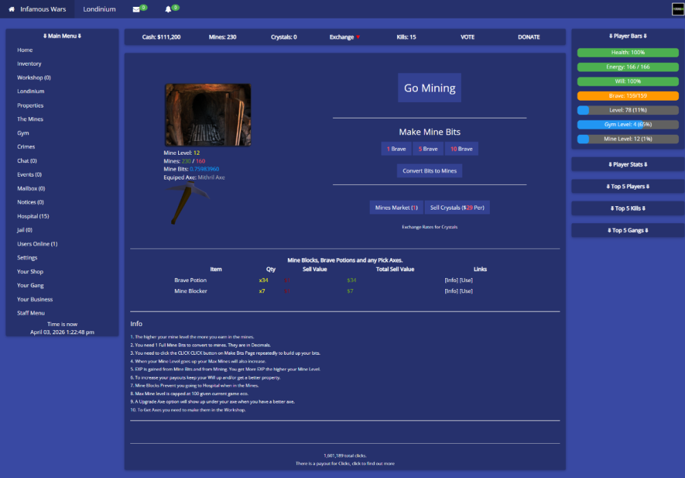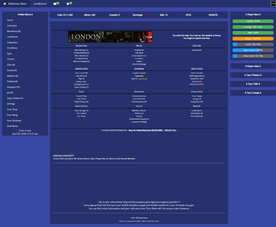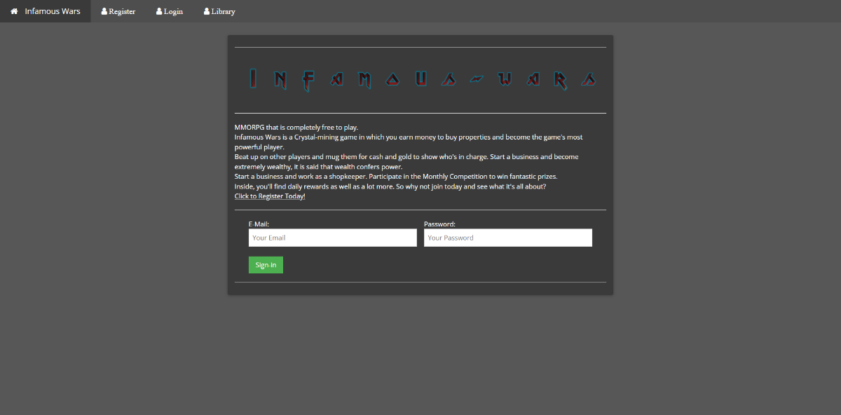 My Game, Infamous-Wars that i've been working on for since 2008 Is back up and fully running again. Its taken a few weeks as alot of work was needed to bring it upto date and working, you know mccodes. Well, Its back and ready to be played. https://infamouswars.peterisgb.com You can also find a window for it on my Desktop website aswell. (link in signiture). Here are some screenshots. I forgot to mention, This isn't the "Original" as it looked completely different and had loads of bugs, this is my 3rd and last iteration.