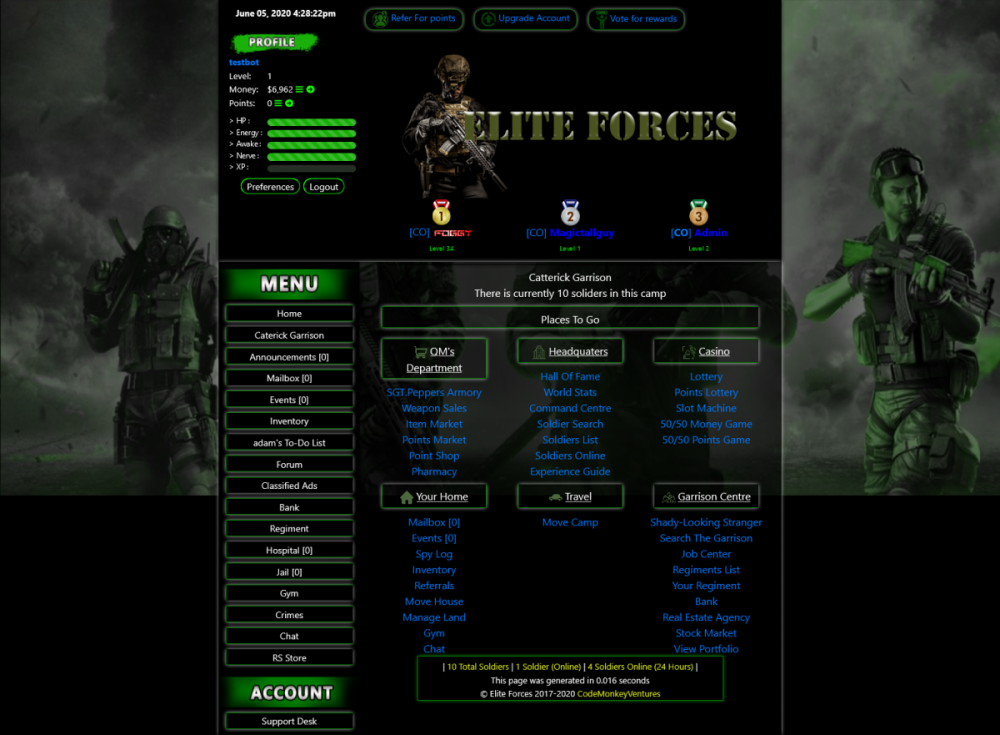 The day has come to open up for a public Beta. 😁 https://elite-forces.com Running GRPGv2 but with modifications added and code updates. Complete new layout added (ingame background differs ingame than screencapture) for some reason screencapture cut the background image off. Responsive for mobile We are now open for registration for anybody who is seeking a new game to play to pass some time through lockdown etc. For anybody just wanting a nosy i have created a demo login for you to use User- testbot Pass- testbot New features include Updated Stock market Points lottery added Daily Login Rewards (coming soon) User profile signitures (with bbcode) Gym training tracking bbcode to gang profiles created gang private profiles for gang members only reponsive to mobile devices new layout (ingame and login/register) 5050 points game announcements username upgrades (Store option. coming soon) updated Search the streets More mods are currently in production and will be added in good time 🙂 still a long way to go until this game will be complete with the additional modifications already in production but it is currently playable and i am looking to build up the playerbase now. Credits go to @AdamHull and @Magictallguy in the creation of modifications and bug fixes. these two are awsome and have done fantastic work so far. any reviews/comments/suggestions are welcomed.