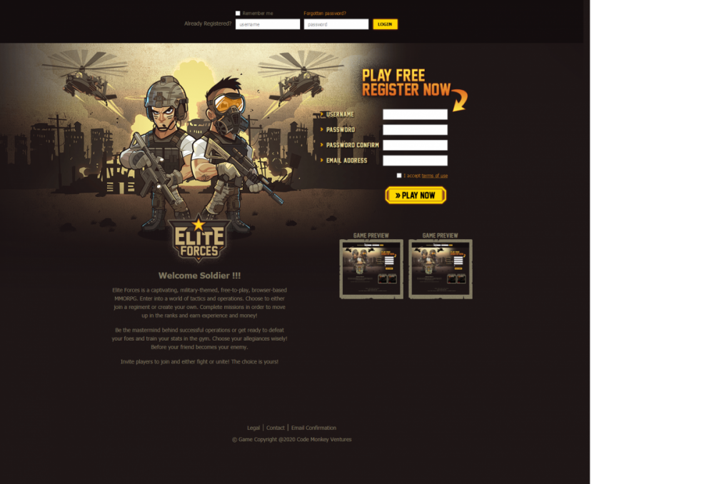 Elite Forces is a captivating, military-themed, free-to-play, browser-based MMORPG. Enter into a world of tactics and operations. Choose to either join a regiment or create your own. Complete missions in order to move up in the ranks and earn experience and money! Be the mastermind behind successful operations or get ready to defeat your foes and train your stats in the gym. Choose your allegiances wisely! Before your friend becomes your enemy. http://elite-forces.com/ In open BETA now We have done a full scale reboot form our previous release and now welcoming back members to join our growing community.