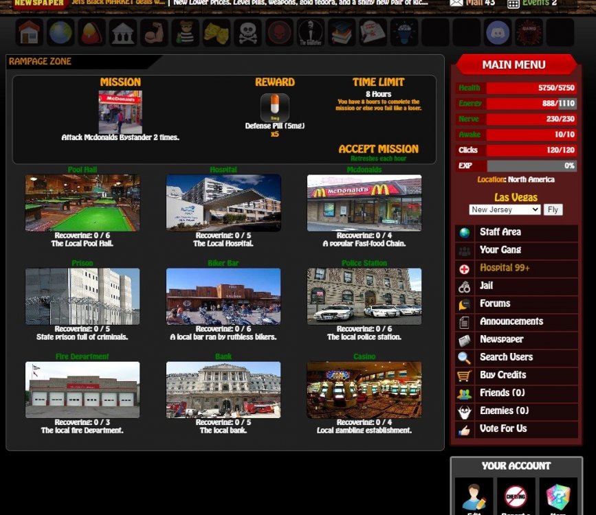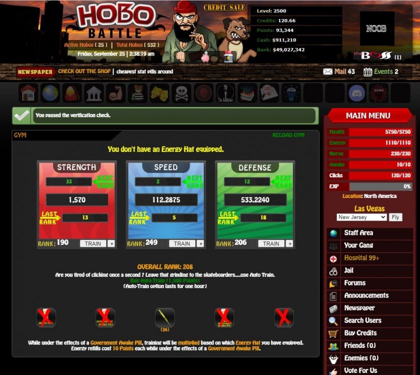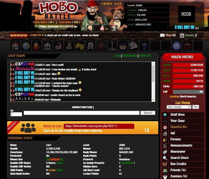 Hello Everyone, I opened a new game back in May 2020 and have been making improvements. The script originated from mccodes but has since grown into my own custom script. The game is loaded with features. I'm currently working on making the website mobile friendly and possibly putting an app on the app store. Feel free to drop some feedback. You can be as honest as you want, I've been around quite a while so I can handle it 😉 This is the home page. If you look close you can spot Dave's Shoutbox mod 😛 Thanks Dave 😉 The game is loaded with custom features like this for instance is my gym page. Here is another feature I created called the Rampage Zone. The gang system is pretty extensive as well. I've got a new position at work, so I have been able to put more time toward developing the game. Check it out : https://www.hobobattle.com Hope all is well, Curt