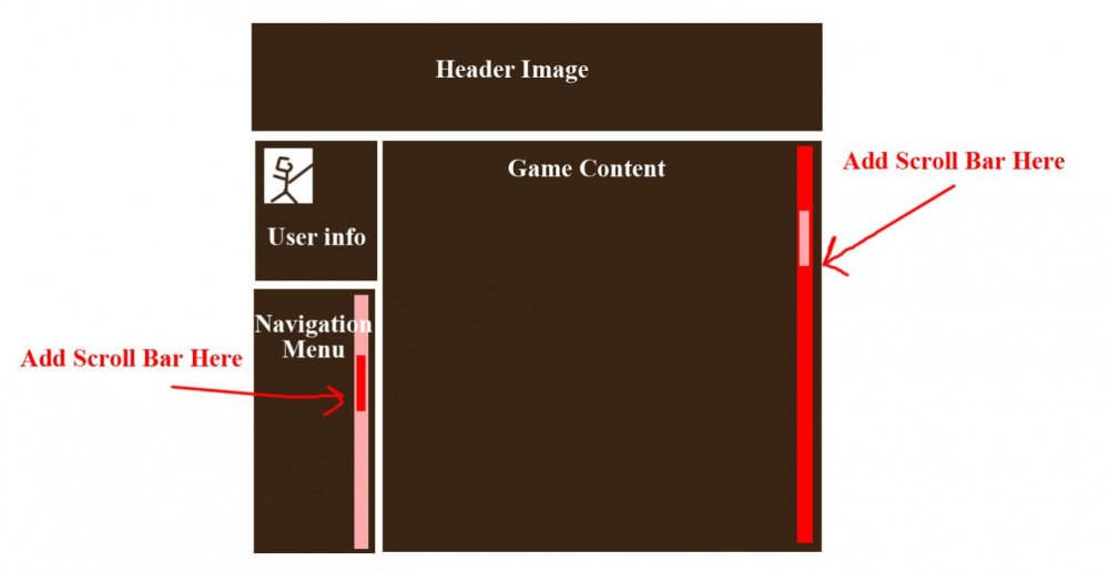 OK, so I know that many pages in the mccodes engine can be paginated if they are exesivly long, such as userlist.php and inventory.php, however, I have found that this is not always effective when developing a browser game. I have considered the use of in content scroll bars. Of course this can be over killed very easy, but I'm interested to see how people would insert this into a mccodes game. For example, If I wanted to scroll a left side navigation menu separate from a main content area. This would allow me to use a custom user interface around a mccodes driven game and add some uniqueness in the appearance, separating it from the other games. How would I go about doing this? I have found that I can create a javascript scroll bar with custom css to make it unique, but I have no idea where to place the code! Header.php, in each separate file, some kind of mixture to this? What do more experienced coders think is the best practice? Lets use userlist.php from the free mods section (don't care if the mod works, just want to use an example of where to place the code for the scroll bar from the free mods available here.) http://makewebgames.io/showthread.php/36303-New-Userlist!?highlight=userlist If you would place it in the header.php, please describe very well where you would place it, and what code snipets you would use and why. Keep in mind, the point of this discussion is for the sake of learning how to do something like this, not to bag on someone's coding skills (or the lack of mine). For those who don't understand what I am talking about .... here is it in digital crayon: