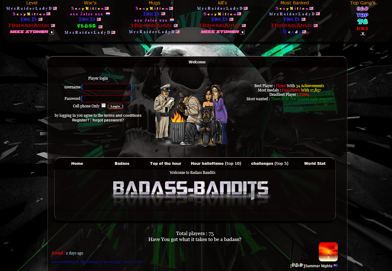 New Grpg script contains profiles war fist mugs mugged kills crimes jail breaks house breaks Grand theft auto *(steal cars) races 5050/5050 points and money city jobcenter pharmacy school classes search downtown weapons market weapons shop points market points shop church ganglist world stats hall of fame drug dealer gang jobs ticket lottery dice bus drive manage land buy land house spy log search Menu on the side home downtown crime jobs missions fight list inventroy bank gym hospital hitlist jail mail events your gang chatroom players menu awaiting points attack log defense logs rules how to play updates your preferences logout there is loads more there will be a demo of the game on the new site with paid mods and free mods am 99.9 percent sure that the script is secure i have had the script uploaded on to my server and tested to make sure there is no bugs if there is the script will be fixed to make sure no-one can get data from any ones games this script cant be sold find out more on the http://www.theGRPG.com about the script Thanks Grant -
