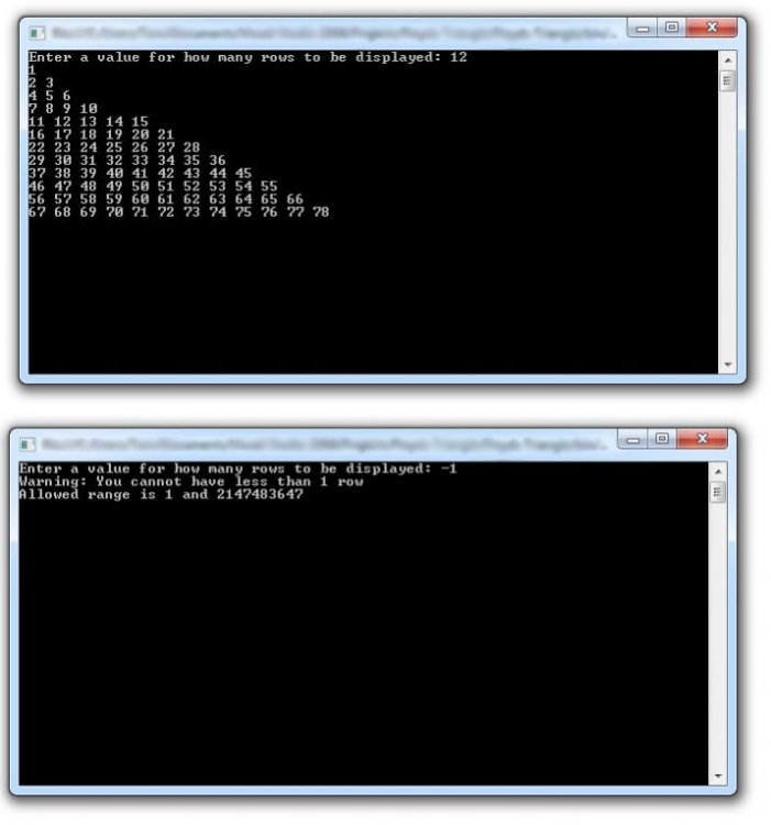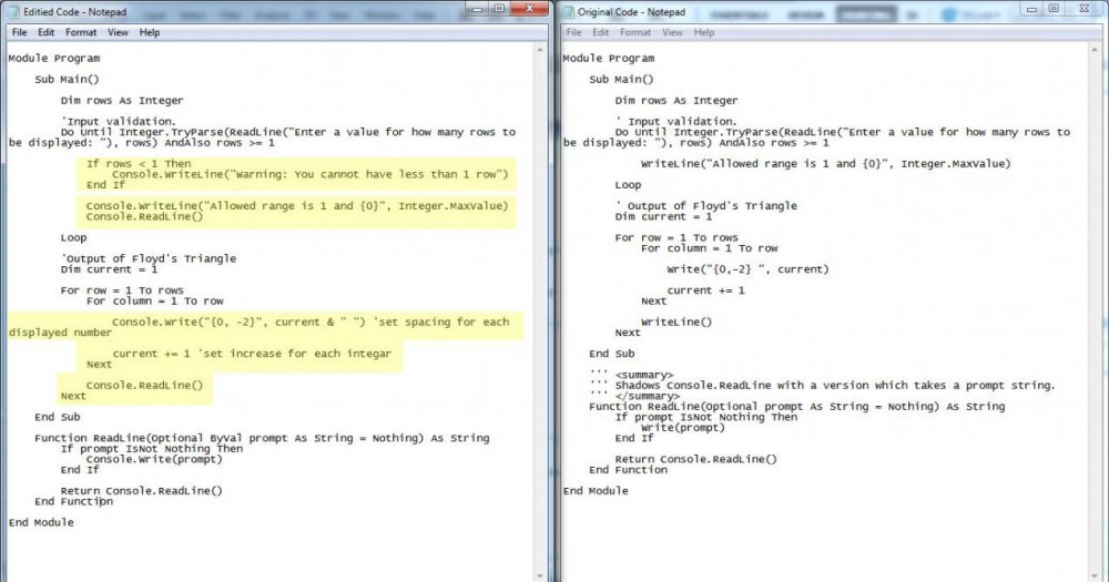 Hey, I would consider myself to be new to the forum, posting wise, however i have been hovering around helping a few people out via PM and reading through certain posts which interest me :) I study visual basic 2008 in education and i happened to fall upon Floyd's Triangle (http://en.wikipedia.org/wiki/Floyd%27s_triangle) and thought it would be an achievement if i were to alter the code shown in the following link for it to have a more appealing UI, in terms of spacing between certain characters and displaying errors messages where appropriate - http://en.wikipedia.org/wiki/Visual_Basic_.NET (bottom of the page, roughly 7/8 down) The reason im posting this up to so you can learn a few tips, if you are studying vb.net and i would like to share with the community a sample of code which i managed to change from wikipedia to work with vb.net 2008 rather than other variations. You are able to freely download vb.net 2008 completely free from the microsoft web page (http://www.microsoft.com/express/Downloads/#2010-Visual-Basic) Visual Studio 2008 Express. Please comment below on what you think its good/effective or what needs improving on, otherwise i hope you enjoyed my contribution. Screenshots are below and code is presented below to. NOTE: I wouldn't consider this as 100% mine as the majority of the code i found on wikipedia.org so therefore I'd just like to point out that i only did slight alterations and added in a few (not many) notes for a programmer/pseudo code user to read and hopefully understand. To be completely honest with you, im not too sure on what everything does, but i hope this inspires some to learn and look into to hopefully make clearer to others :) Module Program Sub Main() Dim rows As Integer 'Input validation. Do Until Integer.TryParse(ReadLine("Enter a value for how many rows to be displayed: "), rows) AndAlso rows >= 1 If rows < 1 Then Console.WriteLine("Warning: You cannot have less than 1 row") End If Console.WriteLine("Allowed range is 1 and {0}", Integer.MaxValue) Console.ReadLine() Loop 'Output of Floyd's Triangle Dim current = 1 For row = 1 To rows For column = 1 To row Console.Write("{0, -2}", current & " ") 'set spacing for each displayed number current += 1 'set increase for each integar Next Console.ReadLine() Next End Sub Function ReadLine(Optional ByVal prompt As String = Nothing) As String If prompt IsNot Nothing Then Console.Write(prompt) End If Return Console.ReadLine() End Function End Module I have attached a comparison screenshot of both original and editied codes so you can see the editied/added pieces of code/information. Again, its not alot in comparison to whats there, but it seemed to fix a few errors i had with the original code. No, i don't think this would come in useful to most people, but it's been said you should be able to code Floyd's Triangle with a language to understand the basic comprehension and understanding of it. Thanks for taking an interest in this post, Many thanks, Become.