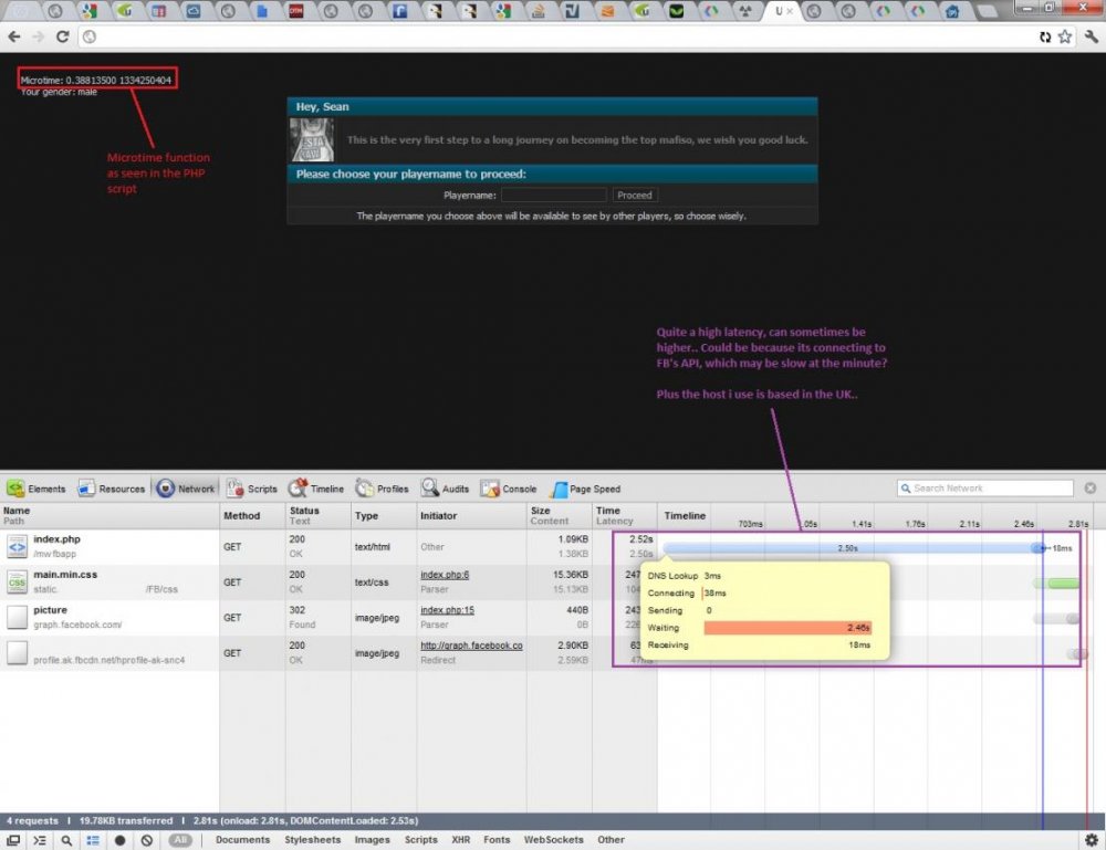 Cheers, ill take a look at that now, ive also attached a screenshot which is showing the latency etc, if this means anything, to anyone.. :) [ATTACH=CONFIG]336[/ATTACH] I had to open the page in a new tab so i could show the network section clearly, so that's why its not in FB's iFrame before anyone asks :P
