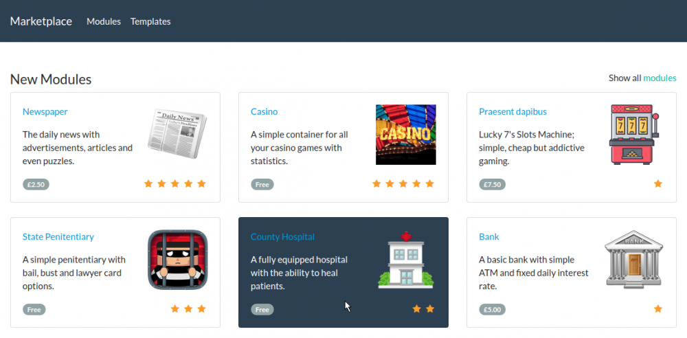 Well, with the apparent lack of action on games here - I've decided it may be time to create my own. It's a tricky thing creating a new game; as it has to cater for so many different needs; so my first port is a marketplace for modules and templates that can be easily pulled into the game complete with dependencies. The image below is representative of the current work so far. (N.B. module names, brief descriptions, icons, prices and stars are all for my own testing). The core game itself is a while off completion yet - getting it to work with the complexity of the plugins system is causing some interesting headaches, but it looks very possible. Once I've got the core working with a basic set of mods - some of which will be dependant on others like the casino games - I need to design a number of templates which may be a task suitable for some of the peeps here - its primarily Bootstrap 4 based with modules having their own specific overrides, graphics, even typefaces etc. Nothing too fancy, but it allows for fantastic customisation. Anyway, enough rambling ... here's a quick preview of the Marketplace home page (or at least the top part of it!). Oh and before anybody points it out - yes I'm aware I forgot to correctly name the slots module!