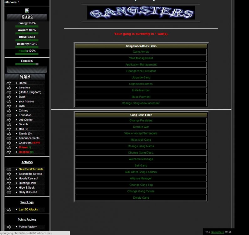 *****I HAVE CLEANED UP THE MCCODE GANG STAFF PAGE SCREEN SHOT ADDED***** [ATTACH=CONFIG]972[/ATTACH] ***********GANG STAFF BETTER LOOK FREE FOR OTHER V2 OWNERS******* function gang_staff_idx() { global $db,$ir,$c,$userid,$gangdata; print "<b></b><br /> <table width=75% border=5 style=text-align:center; class=table> <tr> <th colspan='3'>Gang Under-Boss Links</th> </tr>"; print " <td><a href='gangarmory.php'>Gang Armory</a></td></tr> <td><a href='yourgang.php?action=staff&act2=vault'>Vault Management</a></td></tr> <td><a href='yourgang.php?action=staff&act2=apps'>Application Management</a></td></tr> <td><a href='yourgang.php?action=staff&act2=vicepres'>Change Vice-President</a></td></tr> <td><a href='yourgang.php?action=staff&act2=upgrade'>Upgrade Gang</a></td></tr> <td><a href='yourgang.php?action=staff&act2=crimes'>Organised Crimes</a></td></tr> <td><a href='yourgang.php?action=staff&act2=recruit'>Invite Member</a></td></tr> <td><a href='yourgang.php?action=staff&act2=masspayment'>Mass Payment</a></td></tr> <td><a href='yourgang.php?action=staff&act2=ament'>Change Gang Announcement.</a></td></tr>"; if($gangdata['gangPRESIDENT'] == $userid ) { print "<table width=75% border=5 style=text-align:center; class=table> <tr> <th colspan='3'>Gang Boss Links</th> </tr>";print "<hr /><td><a href='yourgang.php?action=staff&act2=pres'>Change President</a></td></tr> <td><a href='yourgang.php?action=staff&act2=declare'>Declare War</a></td></tr> <td><a href='yourgang.php?action=staff&act2=viewsurrenders'>View or Accept Surrenders</a></td></tr> <td><a href='yourgang.php?action=staff&act2=massmailer'>Mass Mail Gang</a></td></tr> <td><a href='yourgang.php?action=staff&act2=name'>Change Gang Name</a></td></tr> <td><a href='yourgang.php?action=staff&act2=desc'>Change Gang Desc.</a></td></tr> <td><a href='yourgang.php?action=staff&act2=wmsg'>Welcome Message</a></td></tr> <td><a href='gangmarket.php'>Sell Gang</a></td></tr> <td><a href='yourgang.php?action=staff&act2=outsidemailer'>Mail Other Gang Leaders</a></td></tr> <td><a href='yourgang.php?action=staff&act2=alliances'>Alliance Manager</a></td></tr> <td><a href='yourgang.php?action=staff&act2=tag'>Change Gang Tag</a></td></tr> <td><a href='yourgang.php?action=staff&act2=pic'>Change Gang Picture</a></td></tr> <td><a href='yourgang.php?action=staff&act2=kill'>Delete Gang</a></td></tr>"; } } ************ENJOY***********
