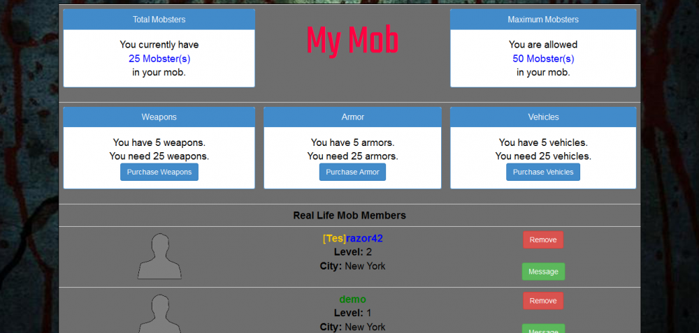 Looking for a GRPG Partner for a myspace mobsters replica gamemags replied to mags's topic in Partnerships im doing ok on the recovery sir ty for asking , Now for my son and me on are skills we are self teaching are selves daily and trying to grasp how it all works some makes sense and some doesnt so thats where we stand on the knowledge now what makes this different from other mob games is 1. myspace mobsters was very popular the 1#app with 30 million players until they pulled the plug on the community and we lost hundreds of accounts and thousands of dollars so some of use went to a game called mafia mofo outstanding game using the grpg script and its a popular game too but nothing like myspace mobsters ,so what im trying to do here is combine both games together and give the mob community a new mobsters game with a new twist and im still coming up with other ideals to add to the game to make it enjoyible with endless play. The database is mysql and I'm wanting to change it to mysqli and I'm also thinking about javascript. [ATTACH=CONFIG]1692[/ATTACH][ATTACH=CONFIG]1693[/ATTACH][ATTACH=CONFIG]1694[/ATTACH][ATTACH=CONFIG]1695[/ATTACH][ATTACH=CONFIG]1696[/ATTACH][ATTACH]1697[/ATTACH] i will add more later for view