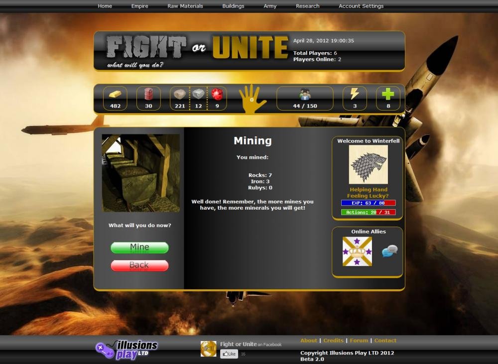 2. Fight or Unite is a Free Text based MMO Strategy Game set in the Present Day. You can develop your country, build an army, or attack your enemies and help your allies. We have tried to come up with a unique or uncommon concept of allowing players to create their own nation, which comes with real world responsibilities like making enough revenue to sustain your nation or protect it from enemies. We have tried to keep it authentic as possible like creating a Raw Materials section where players can Buy mines and Oil Rigs which they can sell for gold or use to create Residential areas for the people living in their nation which grows in population. We have also created an Army section where you can Train your troops to attack and steal resources from other nations which will also help you to level up faster and expand your nation. To create buildings such as Residential areas and Army camps Energy is also needed which can be made by Investing in solar panels and nuclear power plants. In fight or unite most of the features Like the Army camp and Solar panels will have to unlocked by earning research points which is given every time a player levels up, and it is up to the users to spend it in different areas such as Energy research, weapons research and many other types of research which unlocks different features. One other important aspect to fight or unite is its allies system where you can help to protect their nation from enemies or provide loans and trade resources to make sure that their nation is surviving. We also have added an Ajax notification system which sends messages and events in real time to their players without the need to refresh their browser. Fight or unite is still in its beta stage and we hope to add more features such as a tax system and profile rating system and lots more. We would appreciate it if you guys can sign up and provide feedback in areas that we can improve in Fight or unite. We have only been programming for a year so we are new to RPG gaming. Website: http://www.fightorunite.com [ATTACH=CONFIG]533[/ATTACH] [ATTACH=CONFIG]534[/ATTACH] [ATTACH=CONFIG]535[/ATTACH] Thanks Bobby (Business Adviser)