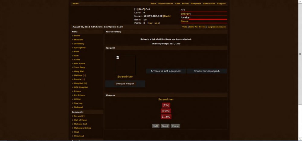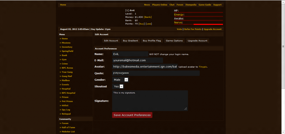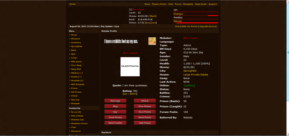2. Hey everyone, So basically I am recoding my entire game, and would like to see some feedback, positive or negative about it, Here are some screenshots: [ATTACH=CONFIG]584[/ATTACH][ATTACH=CONFIG]585[/ATTACH][ATTACH=CONFIG]586[/ATTACH] The following things have been added so far ~ Gang system installed. ~ Profile page revamped. ~ City page revamped ~ Mission Feature Implemented Development of the engine can be found here: http://devengine-silent-mafia.eu Any suggestions are always welcome!