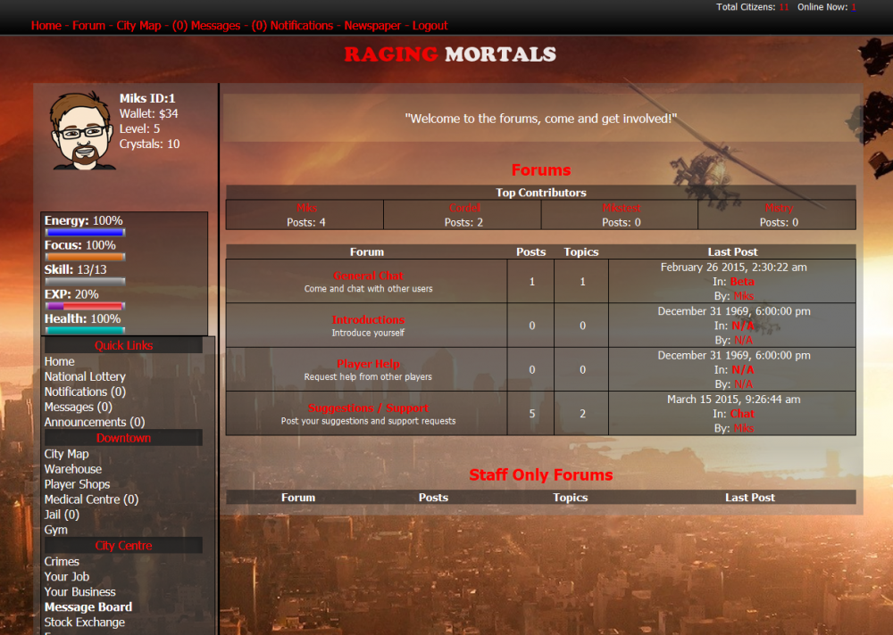 I know theres a paid mod called City Park already, I made it a couple of years ago but wanted to improve it and make it free. **Note this is the first time I am sharing on the forum so might not have put it in the right format etc** The city park allows a user to restore there health once a day to either train some more or battle more users etc I have tested it and it works fine. If you want to use it then just following the below steps 1. You need to alter/add a new column in the users table called citypark [mysql]ALTER TABLE `users` ADD `citypark` INT( 2 ) NOT NULL ;[/mysql] 2. Add this to your daily cron file $db->query("UPDATE users SET citypark = 0 WHERE citypark = 1"); 3. This is the pages source code, you will need to edit it slightly to fit your design as we made a custom css file <?php include "globals.php"; error_reporting(E_ALL); if($ir['jail']) { print "<div class='desc2'> <div class='citstat'> <table class='mytable'><tr><td><center><BR> You cant go any further while you're in jail <BR><a href='jail.php'>Go back to jail</a> <BR><BR></center></td></tr></table>"; $h->endpage(); exit; } if($ir['hospital']) { print "<div class='desc2'> <div class='citstat'> <table class='mytable'><tr><td><center><BR> You can go any further while your in hospital <BR><a href='hospital.php'>Go back to Hospital</a> <BR><BR></center></td></tr></table>"; $h->endpage(); exit; } print " <div class='desc2'> <div class='citstat'> <h2>Welcome to the City Park!</h2> <br /> You walk up to a weird looking fountain, you see an old glass with lots of scratches and brown patches.<BR><BR> Do you take a drink?<BR> <br /> <table class=mytable> <th>Fountain</th> <tr><td><a href='citypark.php?drink=yes'><center>Yes</center></a></td></tr> <tr><td><a href='citypark.php?drink=no'><center>No!</center></a></td></tr> </table> </div> "; if(isset($_GET['drink']) && $_GET['drink'] == 'yes') { if($ir['citypark'] == 1) { print "This has no effect on you"; } else { $db->query("UPDATE `users` SET `energy`=maxenergy,`citypark`=1 WHERE `userid`=$userid"); print ">You have an almighty gulp and magically it restores your energy, awesome!"; } } if(isset($_GET['drink']) && $_GET['drink'] == 'no') { print "Wise choice buddy wise choice!"; } $h->endpage(); ?>