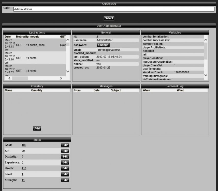 14. New admin user module which encapsulate all the user admin needs: [ATTACH]887[/ATTACH] Using the new hook admin_user_display.php file, any module can now offer a specific user administration, for example the inventory module can let the admin users see what other players have in their inventory and edit it as well. Due to this new hook, many modules have been upgraded to offer at least an initial administration.