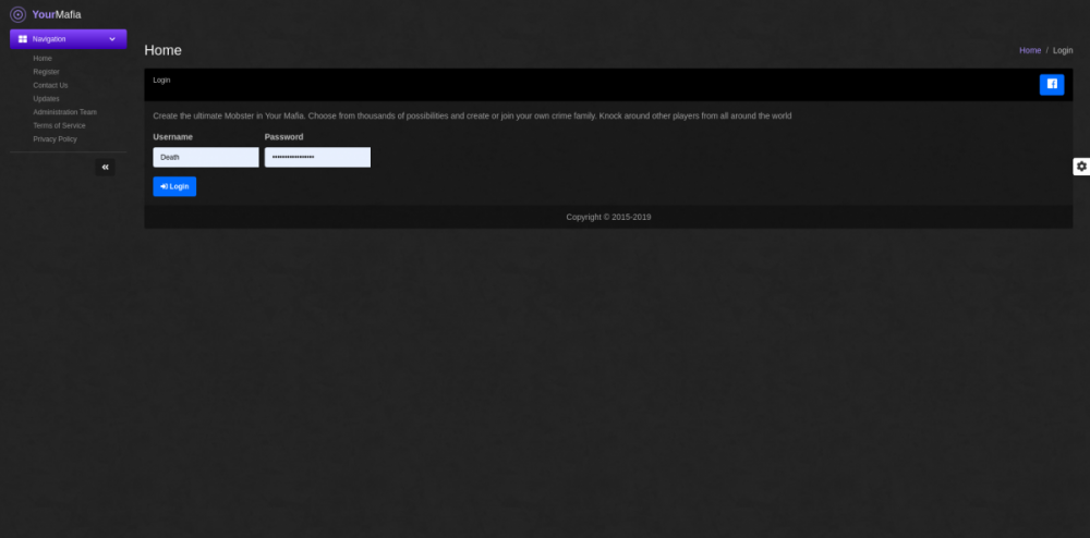 Well hello there, if you're reading this, you must want to know who the hell I am huh? Well, I'm Death, aka Dylan, aka Stoner Death, 24 years old at the time of writing (birthday in 29 days) I've been a webmaster / developer's apprentice (won't go as far as calling myself a dev just yet) for the past 14 years and recently have gotten back into coding. I've been learning under Mtg while running my own game... I'm the new official owner of Your Mafia Gaming or Your Mafia which was acquired in October of 2018 when the original owner decided to abandon his community and finally ended up leaving ownership to me. As you may have read in the thread for Magictallguy, we've been busy on revamping the game for the community. Currently, the game is a live version of a recoded gRPG v1 fully customized and rewritten to be PhP 7.2 compatible and use MariaDB with a closed BETA currently in development for MVC support. The Screenshot above, is the login page for the Mvc version - what you see here is Color Admin being re-purposed for front end use.