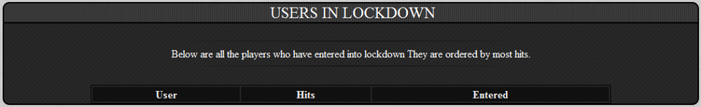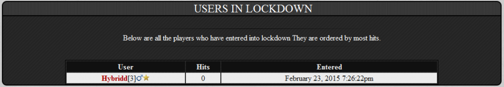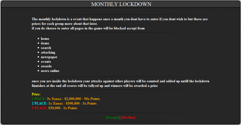 yes i have full rights to sell copies of the mod, you can ask [MENTION=70347]NonStopCoding[/MENTION]. The part i missed out: The player has a choise to join the lockdown. When player joins they have to attack other users to survive the lockdown. Once theyve attacked a user it will be counted as a hit. 3 people will be chosen at the end of the lockdown with the most hits for 1st place, 2nd place and 3rd place. The prizes can be changed to whatever u chose in the cron file. If the lockdown is not active then users will not be able to join. there is also a staff page for staff users they can change what pages are blocked.