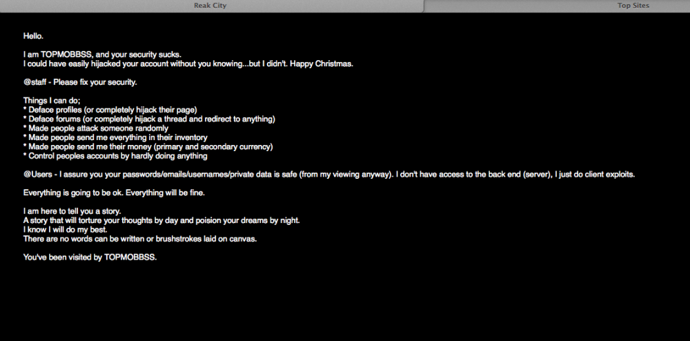 It's a shame the whole game is full of security holes. Don't worry your socks; I'm not going all out. Just a simple test and I've notified staff. What I could have done; Diverted all traffic to a server I own somewhere in the world, and hijack their session. I'll have free reign over their account. Even if they change their password, I'll still be in Send items to other accounts Send money to other accounts Blah blah blah Get into a staff account and execute any server side code I wanted via crime exploit Give me any item in the game Make me max level Give me max stats Blah blah blah [*]Deface my profile [*]Deface forum topics (2 ways I can do this)