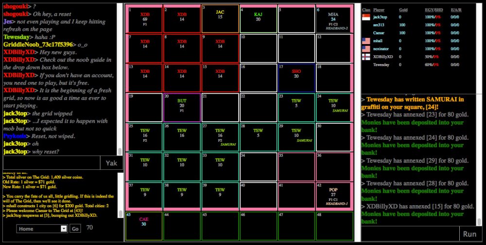 Check it out, let me know what you think. It's very old-school, supposed to be Retro. Was featured on Indie Games a few years ago, but could still use more players (20-30 active players a day). Build text-based cities and farms. Hire wizards, steal gold, pick up to 9 character traits, attack your neighbors, and try to Rule The Grid!