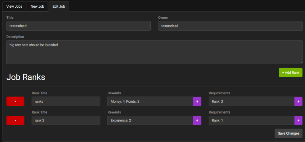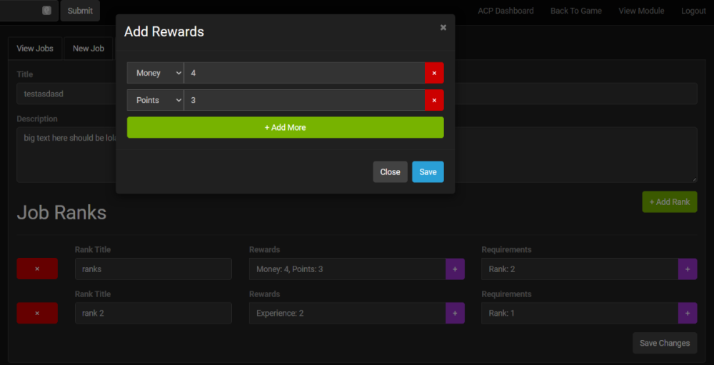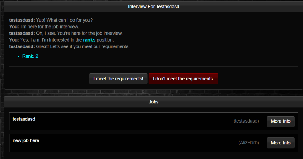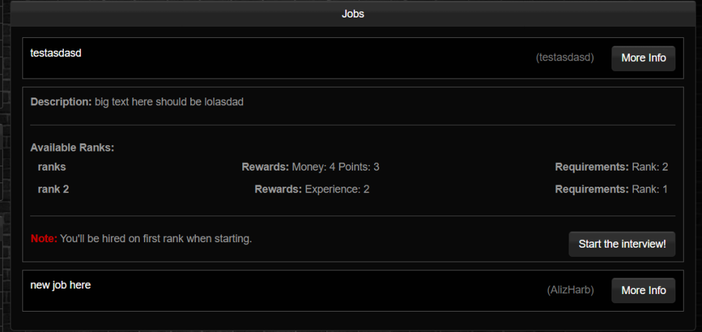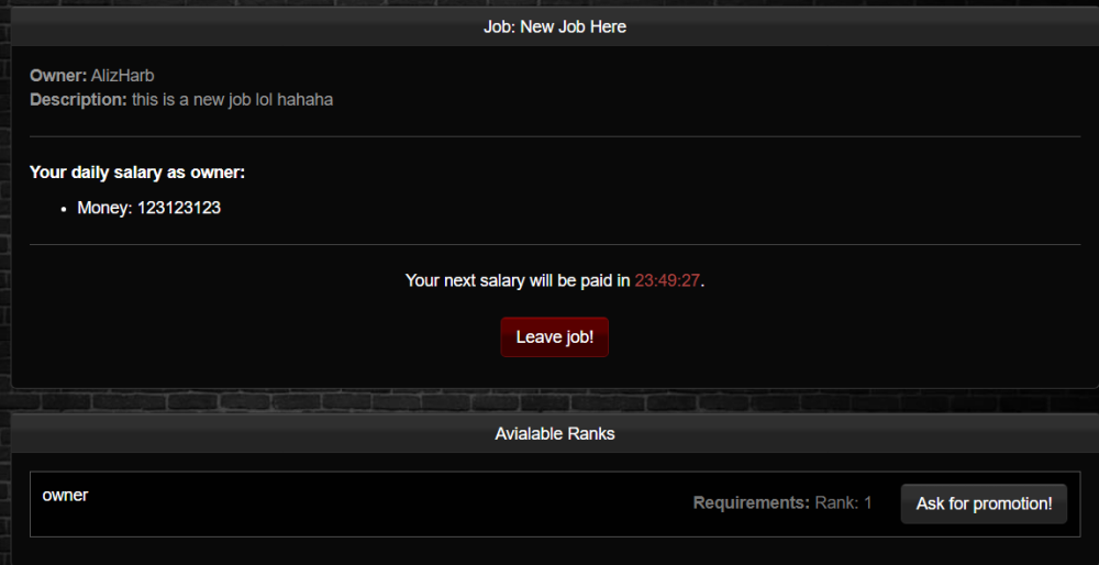 Hello everyone! I’m offering a Jobs System module that can be integrated into GLv2. This module provides the functionality to manage job postings, promotions, hiring, and more for a user-driven environment. Here’s a quick overview of what the module includes: Features: Job Creation and Management: Admins can create, edit, and delete jobs, along with managing ranks and descriptions. Detailed validation for job titles, descriptions, and other important fields to ensure accuracy. Job Board for Users: Users can view available jobs, apply for positions, and get hired after meeting the requirements for the job rank. The ability to be promoted within a job position based on their performance. User Notifications: Users receive notifications when they are hired, promoted, or when they leave a job. Customizable messages such as "Congratulations" and "Job Applied Successfully." Job Application Process: Users can apply for jobs, attend interviews, and start a job upon fulfilling specific rank requirements. Admins can set specific rank requirements for different job positions. Admin Controls: Admins can add new jobs, edit job details, and delete jobs that are no longer needed. Full control over job listings, rank assignments, and job descriptions. Job Salary Timer: A salary timer to simulate daily job rewards or other recurring benefits. Example of Usage: Admin Panel: Manage job listings, update positions, and monitor users. User Panel: Apply for jobs, be promoted, and receive rewards based on job performance. Key Benefits: Easy integration into any GLv2. Flexible job ranking and requirement system. Highly customizable to fit the needs of any role-playing game or simulation platform. Price: 60$ If you're interested or have any questions about the module, feel free to PM me or reply to this thread. I can also provide support for integration if needed. Screenshots: