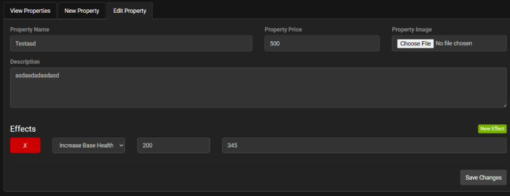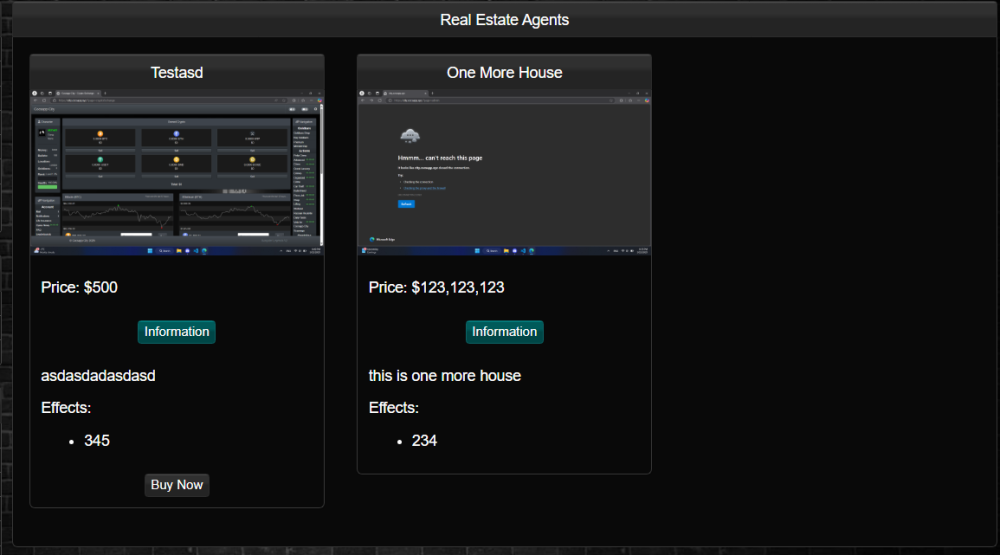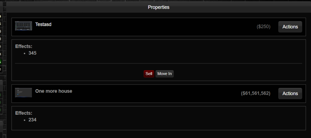 House Management Module for Your GLv2 Are you looking to enhance your game with a fully functional House Management System? Look no further! This module allows admins to create, edit, and delete properties while giving players the ability to buy, sell, and move into properties seamlessly. Features: Admin Controls: Add new properties with name, description, price, effects, and image uploads. Edit existing properties with full validation checks. Delete properties from the system. View a full list of available properties in an admin panel. Player Features: View available properties via the Real Estate Market. Purchase properties (checks if they can afford them). Sell owned properties at half the original price. Move into a purchased property. Property effects are fully supported. Screenshots: Price: 60$ This module is a perfect addition to any game that wants to implement an engaging real estate system with buying/selling mechanics. Interested? Reply here or send me a message to purchase! Demo: https://alizgg.com/ User: admin pass: admin Big thanks for @Dayo