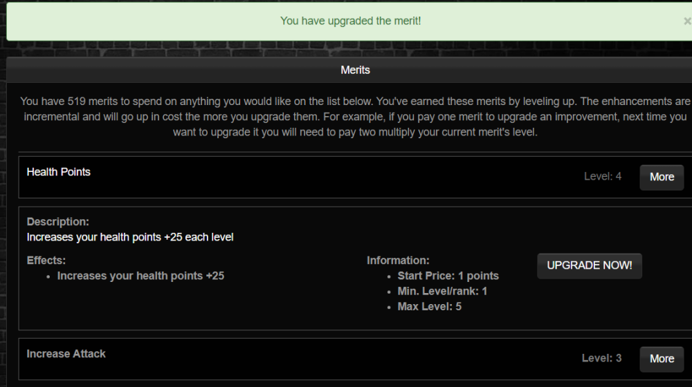 Hello everyone! I’m offering a Merits System Module that can be integrated into your GLv2. This module provides a fully functional merit-based progression system where players can earn, upgrade, and manage merits to enhance their gameplay experience. Here’s a quick overview of what the module includes: Features: Merit Creation and Management: Admins can create, edit, and delete merits, along with managing levels, descriptions, and prices. Detailed validation to ensure merit names, descriptions, and pricing are accurate and balanced. Merit Upgrades for Users: Players can upgrade their merits based on their rank and available points. The upgrade system scales in price as the player progresses, making the system more rewarding and engaging. User-Level Integration: Merits are tied to user ranks and levels, ensuring a balanced progression system. The ability to upgrade merits as players achieve higher ranks or levels. Admin Controls: Full control over merit creation, deletion, and editing. Manage effects, descriptions, and prices with ease. View and manage all available merits with a clean, structured list. Merit Upgrade Process: Players can view available merits and upgrade them based on available points. The upgrade cost increases with each merit level, providing a challenge and rewarding progression. Key Benefits: Easy Integration: The module is compatible with PHP-based game systems and can be integrated seamlessly into your existing framework. Flexible System: The merit points, upgrade prices, and effects are all highly customizable, allowing you to tailor the module to fit your game. Engaging Progression: The merit system is designed to keep players engaged with incremental upgrades, challenges, and rewards. Price: 60$ If you're interested or have any questions about the module, feel free to PM me or reply to this thread. I can also provide support for integration if needed. Demo: Game Name - Game News User: admin Pass: admin Screenshots: Feel free to make any adjustments! Let me know if you want to add anything else or need further help. 😊