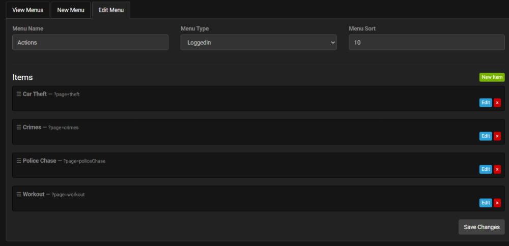 Menu Manager Module for Your GLv2 Need a powerful way to manage your in-game menus with ease? The Menu Manager Module gives you full control over dynamic, draggable, and editable menu systems—all within a user-friendly interface. Features: 🛠 Admin Controls: Create new menus and submenus on the fly. Drag-and-drop interface for reordering menu items. Edit menu items via modals with fields for label, URL, sort, timer and extra. Toggle item types. Delete or disable unused menu items. ⚙️ Smart Logic: Real-time updates with smooth transitions. Automatically nests submenu items with visual hierarchy. Fully integrated with your GLv2 engine’s permission system. 🧪 Developer-Friendly: Clean and extendable codebase. Supports custom icons and advanced link options. Easy integration with existing modules. 📸 Screenshots: 💵 Price: 50$ Whether you're building a game panel, a roleplay control center, or just need a clean way to manage in-game UI—this module makes your life easier. Interested? Reply here or message me directly to grab your copy! Live Demo: https://alizgg.com/ 👤 User: admin 🔐 Pass: admin