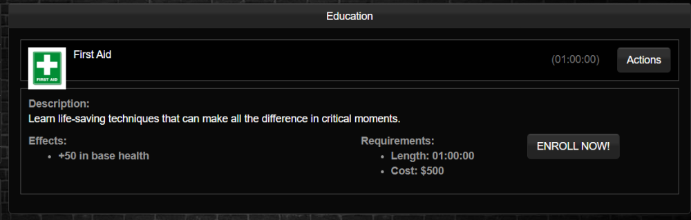 New Effects Added: Increase % Crimes Chances Decrease % Crimes Timers Increase % Crimes Outcomes (Money) Increase % Crimes Outcomes (Bullets) Increase % Crimes Outcomes (EXP) Decrease % Education Timers (If you have the module active) Decrease % Education Costs (If you have the module active) Decrease % Properties Costs (If you have the module active) Will add more effects if GL gets more hooks updated in each module. Note: The module works fully with hooks, can be customized very easy.