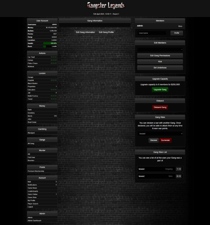 Gang War Module for Your GLv2 Bring your gang system to life with this fully integrated Gang War Module—perfect for any crime, mafia, or roleplay game running on the GLv2 engine. 🔫 In-Game Warfare Made Easy Let your players declare and surrender wars, earn war points through PvP kills, and track it all through a seamless interface. 🛠 Admin Controls: View all ongoing or past wars. Delete wars with a single click. Set gang war timers and update settings instantly. ⚔️ Gang Member Actions: Declare wars on rival gangs. Surrender if the heat gets too high. View all current wars with stats and status. Automatically earn war points for killing rivals. ⚙️ Integrated Logic: Hooks into userKilled, gangPermission, clearRound, and gangHome. Prevents invalid war logic (e.g., attacking your own gang or re-declaring). Fully permission-controlled—only authorized members can start/surrender wars. Visual display of points and war progress on gang home pages. 🧪 Developer-Friendly: Clean modular code. Easy to extend or modify. Hooks and settings-based customization. Fits directly into GLv2’s permission and template systems. 📸 Screenshots: 💵 Price: 25$ Whether you're building a competitive gang-based game or want more depth for your GLv2 factions—this module adds instant engagement and replay value. Interested? Reply here or DM me directly to grab your copy! 🔗 Live Demo: https://alizgg.com/ 👤 User: admin 🔐 Pass: admin