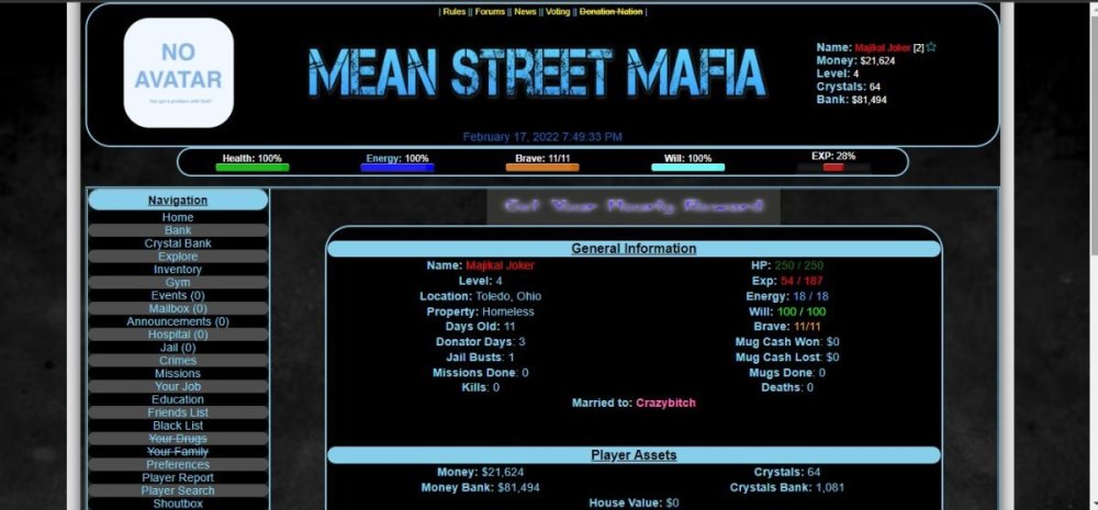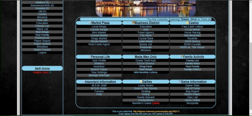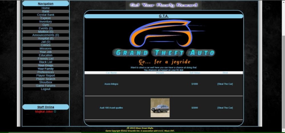 ! - ! Game Name: !-! Mean Street Mafia ! - ! Game Link: !-! https://tstgame.makeweb.games/ ! - ! BETA CODE: !-! ! PLEASE COMMENT IN ORDER TO BE GIVEN THE BETA CODE ! ! - ! BETA Date: !-! March 1st. 2022 - June 1st. 2022 //////////////////Details\\\\\\\\\\\\\\\\\\ This private beta testing is meant to work out some of the bugs and possibly discover any bugs, users will have access to most of the game with a few features unable to be accessed and used. Please keep in mind that this is only a beta test and things are still being fixed and worked on. This private beta is ONLY accessible to people with a code.[*] //////////////////What We Need/Are looking for\\\\\\\\\\\\\\\\\\ We are looking for players/users to play the game, level up, do crimes, attack others, and overall use the game as normal. We would like users of this beta to report any bugs, issues, comments, or ideas to any member of the ADMIN's and/or may post them in the forums. Please be willing to include as much detail as you can! We are looking for ALL feedback including anything that has to do with the layout and colors. All details matter and we will take into consideration. //////////////////Users will have access to\\\\\\\\\\\\\\\\\\ Commit crimes. Attack other players. Most dailies. Banks(Money & Crystals) With high Interest. Explore the city with plenty of options to choose from. Exclusive Bunny features allow users more control over being a Bunny. Mug users for cash or crystals.[**] Train your stats. Stocks. Some Missions. Some education classes. Casino-style games (i.e. Fast-Cash Lottery, 3-Cup Monte, Horse Racing, and ect.) User Marriage. //////////////////Users will NOT have access to\\\\\\\\\\\\\\\\\\ Gangs/familys Specific donator only sections Donation Nation (donator packs)[***][****] Loan System Voting Drug Market Drug Farm NOTE[*]: In order for us to keep the system in control, we must limit the amount of "random" users joining. This is so we can do accurate testing of user specific features. NOTE[**]: Users may mug others for Money or Crystals, Mugging online is encouraged in this game. Users who want to complain about online muggings are not welcome. NOTE[***]: Donator Packs are available upon asking the Admins of the game, Donator Packs are as followed 10 days($1), 20 days($2), 30 days($3). NOTE[****]: Any user that buys a Donator Pack during this beta, Will receive a code for an Free Donator Pack upon next test. -