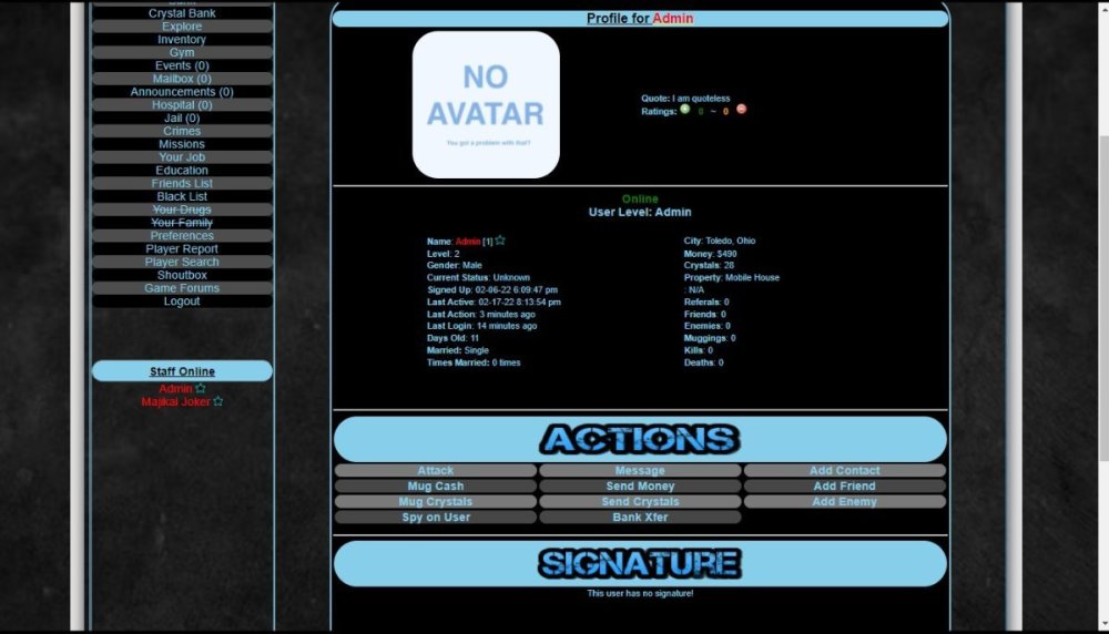 UPDATE: 02/22/2025 I have been able to find a new host, so i am now starting to work on this again. (NEW SCREENSHOTS ADDED ASWELL) I have also done some organization on this page with better details and info. if anyone would like to add their input or view, please do! Thanks! ╔═════════════════╗ ║ Main Details ║ ╚═════════════════╝ Redesigned Gang System with more interactiveness with users, from the leaders down to the newbies. adding more in-depth functions and system mechanics to make the thing a little more tougher to users to simply make a gang and blow everyone else out. adding a more true-to-life system of taking money, crystals, members, and respect to build the empire you want ╔═══════════════╗ ║ Pre-Set Gang Ranks ║ ╚═══════════════╝ (STATUS: DONE) Gang creator is auto set as "Leader" and has all privileges. Members that join the gang are auto set to "Recruit". leader will be able to set each member ranks after they join, each rank has its own set of privileges. ~~~~ Rank system breakdown ~~~~ Recruit = OG Crimes, Gang Mail, Forums Street Soldier = [ ABOVE +] Recruit members. Capo = [ ABOVE +] Manage Vault & Armory. Underboss = [ ABOVE +] Manage Gang Wars, Manage Gang Apps, Change Announcements, Change Gang Description. Leader = [ ABOVE +] Change Gang Name, Change Gang Tag, Upgrade Gang Capacity. ╔══════════════╗ ║ Gang Mail-Chat ║ ╚══════════════╝ A very basic chat system has been made ╔═════════════╗ ║ Gang Respect ║ ╚═════════════╝ (STATUS: 75% DONE) Gang can earn respect by simply doing the following: Successful OG Crimes. Gang Wars. Winning against other users that are in a gang. Gang can lose respect by simply doing the following: Losing Wars. Failed OG Crimes. Losing against other users that are in a gang. ╔═════════════╗ ║ Gang Banner ║ ╚═════════════╝ (STATUS: DONE) self-explainable lol... gang banner viewed on "yourgang" page, Gang list, and when viewing gang. ╔══════════════╗ ║ Gang Leveling ║ ╚══════════════╝ (STATUS: DONE) Gang can level up by doing the following: Winning fights with other users that are also in a gang. Successful OG Crimes. ╔═════════════╗ ║ Organized Crimes ║ ╚═════════════╝ (STATUS: DONE) All members can start them, each crime made has different requirements to start. (Gang Level, Members, & REP.) Game Owner is able to make the requirements on the game back-end(staff panel) Crimes reward gang with any or all of the following: Respect, EXP, Money, and Crystals. ╔══════════════╗ ║ Vault & Armory ║ ╚══════════════╝ (STATUS: 10% DONE) Gang members can donate Money, Crystals, and items to gang, staff can do mass payments and can give individual users payments or items that have been donated to gang. !!! MORE DETAILS TO COME !!! ╔═════════════╗ ║ View Gang Page ║ ╚═════════════╝ (STATUS: DONE) Includes: Gang Details (Gang Name, Respect, Level, Gang Banner) Gang Description (BBcode compatible) built-in Gang Apply link List of gang members (includes: Username, Level, Rank, User Online/Offline) ╔═════════════════════╗ ║ YourGang/Private Gang Page ║ ╚═════════════════════╝ (STATUS: DONE) Actions section (links to view Summary, Members, Donate, Crimes, ect.) Announcements (BBcode compatible) Latest Events {MAY REMOVE} ╔═════════════╗ ║ Log System ║ ╚═════════════╝ (STATUS: 5% DONE) Vault/Armoury log of last items donated track total # of User(in a gang) Attacks Won & Loss track total # of Wars won & loss track total # of OGCrimes done Success and fail Logs of OGCrimes User Attack & Defend Logs Gang Event log(users applying to join, getting kicked, ect.) ╔════════════════╗ ║ Gang Upgrade system ║ ╚════════════════╝ (STATUS: DONE) A detailed multi-level upgrade system. Users "Buy" the ability to be able upgrade Gang in parts, each one can be adjusted to game owners setup and system ~~~ Gang Capacity ~~~ Unlocks the ability to upgrade gangs capacity Upgrades requires a specific gang level, respect, money, and crystals. ~~~ Gang Vault ~~~ Unlocks the ability to have a gang vault ~~~ Gang Armory ~~~ Unlocks the ability to have a gang armory ------------------------------ SCREENSHOTS -----------------------------
