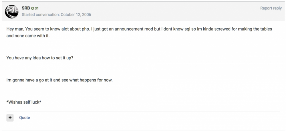 If you have any messages in your inbox, post the first one here. Embarrassment, n00bism, etc all welcome. #ohsonoob