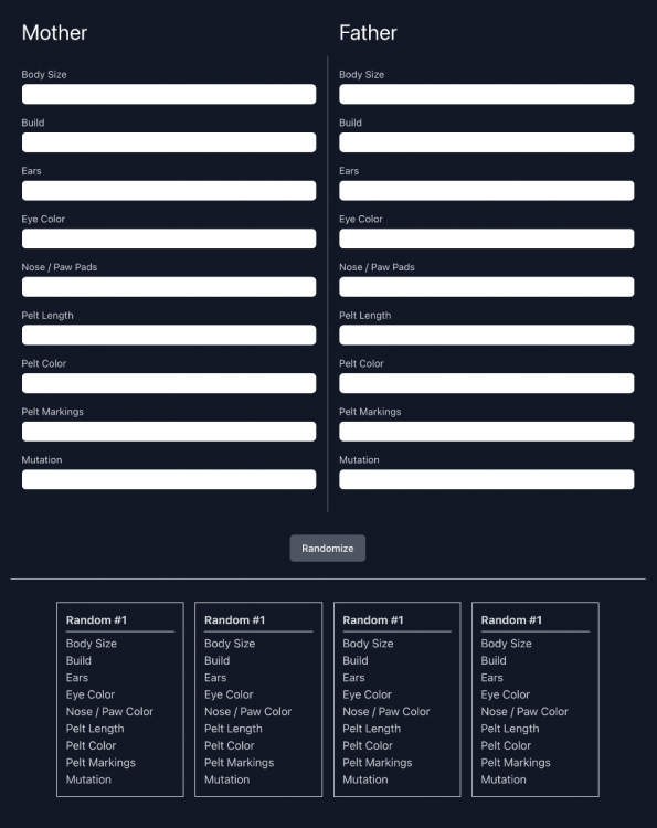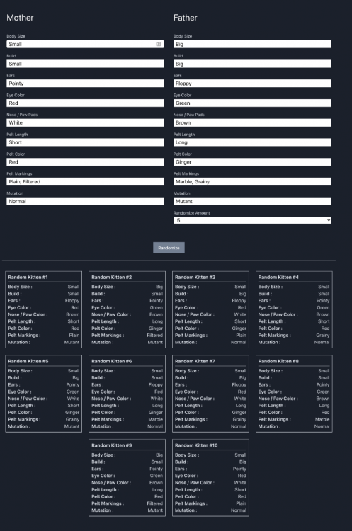 The post doesn't state much detail with regards to what happens with the data; 1. Does the list save anywhere, or is this just so people can copy and paste the results for whatever reason this is needed? 2. From that picture, it makes me feel like it randomly (for each kitten) just picks between the options from the mothers and fathers details - is that correct? Or can random options be a result? 3. Does this have an admin panel for adding/removing options for each drop down, or do you have a pre-defined list? Re-read and saw text fields. Think that covers the questions that'll be needed to realistically build a picture of work needed π
