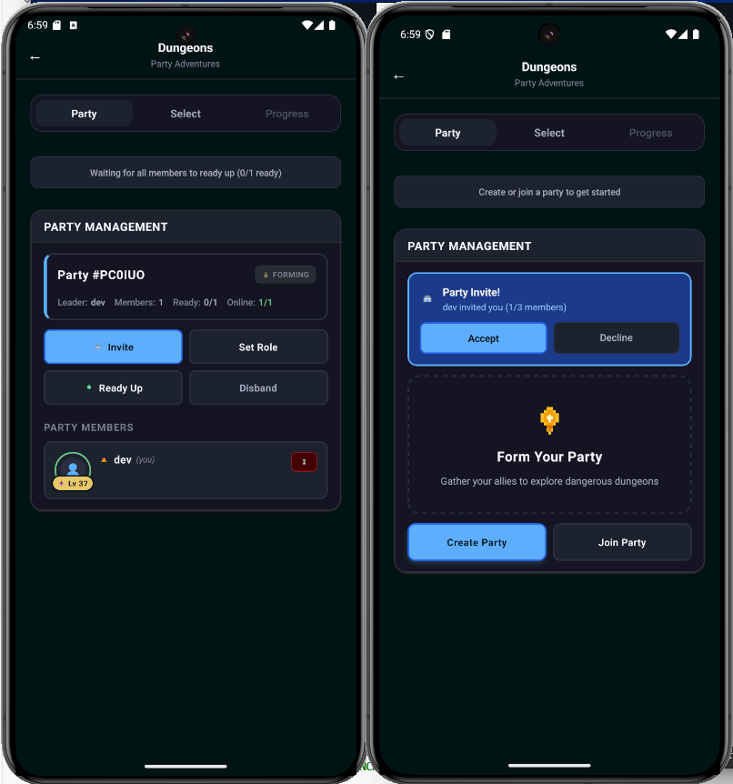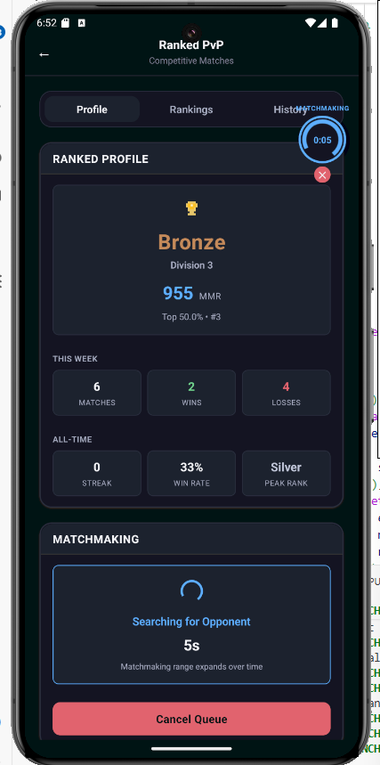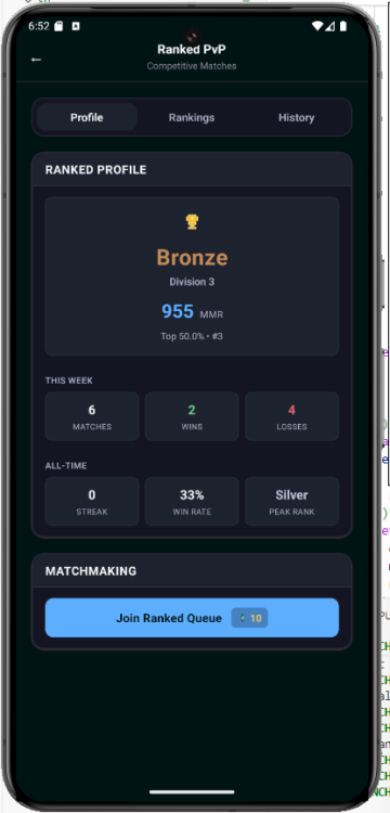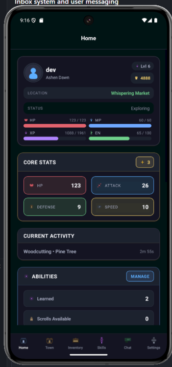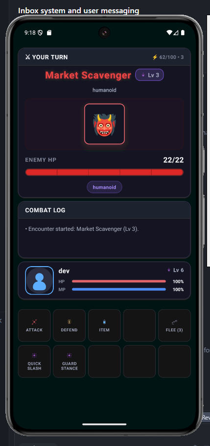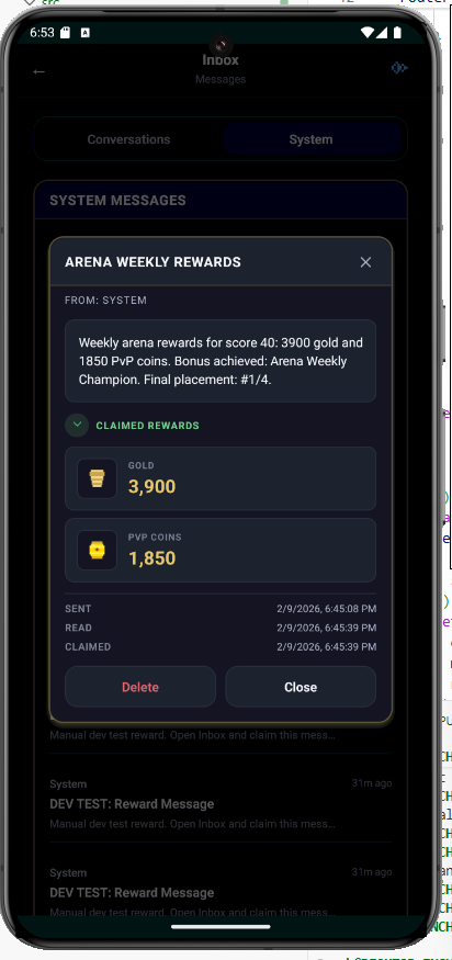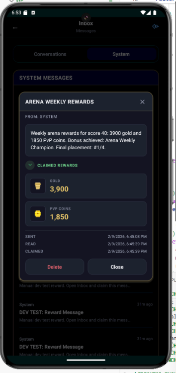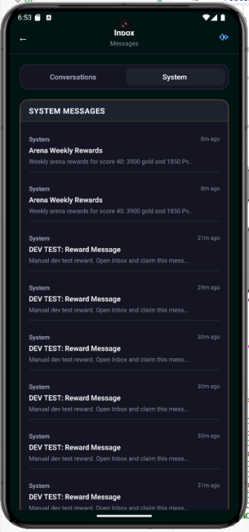 Not sure what PVP style of game to do took me couple days to build this out with much effot and bugs. 1: ARENA : Player vs Player AI ( Daily Event 5 rounds each day. Reward provided weekly) 2.RANKED: Player vs Player Live (Match making - unlimited based on energy cost 10) 3. DAILYHUNT: Player vs Monster (AI) - Energy usage , standard drops 4. DUNGEON: ---- 1. INBOX: conversation (like mobile text) , system message MVP is done - now the hard grueling grind to add more features and linked them all