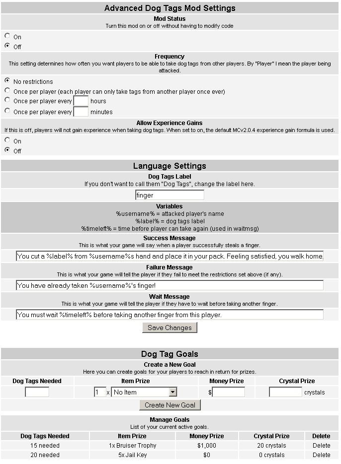 Arson Posted May 10, 2012 Posted May 10, 2012 (edited) Dogtags with Goals & Rewards This is one of my most customizable mods to date. It is not to be confused with the usual "Dog Tags" systems you see. While similar, it is definitely not the same. The concept is simple, players attack other players, and depending on your settings, gives them the option of stealing a "dog tag" upon defeating a player. Here's what you can do in the extensive staff panel: Change any of the language (words shown to the players) within the mod, as well as the label for dog tags. You can call them scalps, fingers, ears, dog tags, paperclips, whatever. Set how frequently you want players to be able to steal other players' tags. Create/Delete Goals for Players to achieve and receive rewards Turn on/off the modification entirely, for seasonal use. Turn on/off experience gains when stealing dog tags If the player reaches any of the goals set by you, they receive an event and the reward you set for that goal. This mod is an excellent way to get your players active and involved in the game. The price for this mod is a cheap $10 As with all my mods this includes full support and updates for life. View Screenshots and Purchase this Mod through WebGameMods.com Alternatively, if you have an MCCodeMods account you can purchase my Dogtags with Goals & Rewards Mod through there. Edited June 2, 2012 by Arson Quote