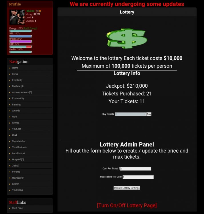 NonStopCoding Posted February 23, 2016 Author Posted February 23, 2016 My Evil Doing - Critical Error A critical error has occurred, and this page cannot be displayed. Please try again later. Query failed i keep getting this error every time i try to update the ticket price and max lotto tickets my bad change You're unable to view this code. Viewing code within this forum requires registration, you can register here for free. to You're unable to view this code. Viewing code within this forum requires registration, you can register here for free. Quote